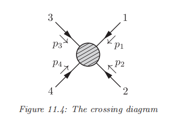 下面,我们将说明这三种现象实际上同一件事的三个方面。这一件事称为交叉(Crossing)。 上面提到,这些散射过程实际上都是涉及到四个粒子的过程(两个入射,两个出射),我们可以用下面的图来描述这一类过程:
