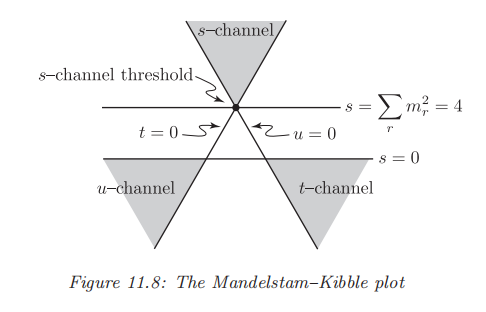 图上的点称为Mandelstam-Kibble plot。实际上,上面的图在考虑三粒子衰变时同样是常用的(能量守恒条件为三个粒子能量和为常数),此时的点称为Dalitz plot。 现在,我们来考虑图上的各个区域分别代表了怎样的散射过程。实际上,并不是平面上的所有点都代表了实际的物理过程。为说明这一点,先假设各粒子质量相等。对于三角形内部的点,其三个Mandelstam变量都为正,但是我们知道其中一定有两个代表动量转移,而动量转移的平方必为零或负数。这是因为: