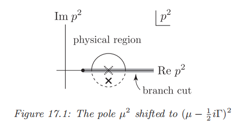 因此现在的极点由原先在实轴上的 \(p^2=\mu^2\) 移至现在的实轴下方 \(p^2=\left(\mu-\frac12i\varGamma\right)^2\)。另一方面,传播子仍具有实轴上的割线。在微扰的意义下,割线的起点为: