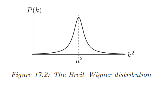 这个分布称为Breit-Wigner分布,其在 \(k^2=\mu^2\) 处有一个峰,即最容易产生该动量的粒子。但是,衰变率导致实际分布有一个宽度。同时,在质心系中考虑,则 \(k^2=E^2\),由于