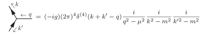 ^{\text{out}}\langle k,k'|\phi'(0)|0\rangle=(-ig)\int\mathrm{d}^4q\,\delta^{(4)}(k+k'-q)\dfrac{i}{q^2-\mu^2}=\dfrac{g}{(k+k')^2-\mu^2}